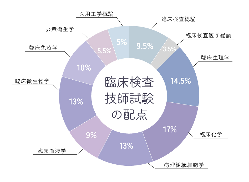 この中でも,臨床生理学・臨床化学・病理組織細胞学・臨床血液学・臨床微生物学は配点が大きい傾向にあるので,厚めに対策をする必要があります.