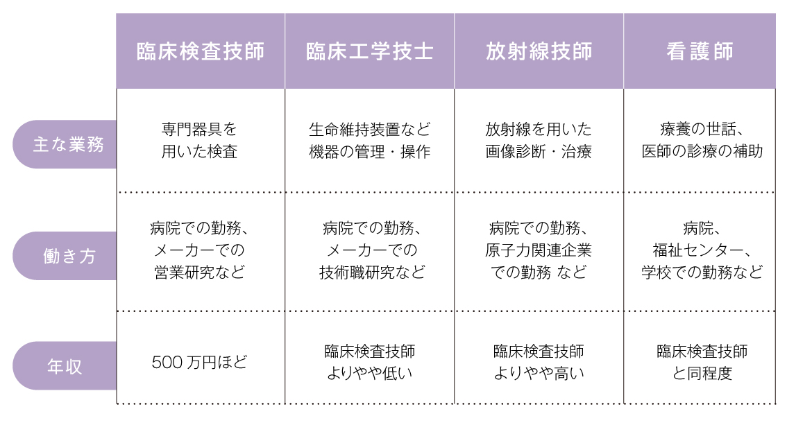 専門的な機械の操作はできませんが,医師の指示のもとで注射や点滴,酸素投与など診療の補助となる行為は行えます.また臨床検査技師よりも,患者との交流が多いことも特徴です.働き方としては病院勤務が一般的で,24時間稼働するために交代制や長日勤などさまざまな勤務形態があります.その他の勤務先には福祉施設や学校,訪問看護ステーションなどがあります.平均年収は臨床検査技師と同等程度です.